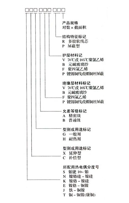 1、補償導線型號按產(chǎn)品的品種劃分為:SC、KC、KX、EX、JX、TX、NC